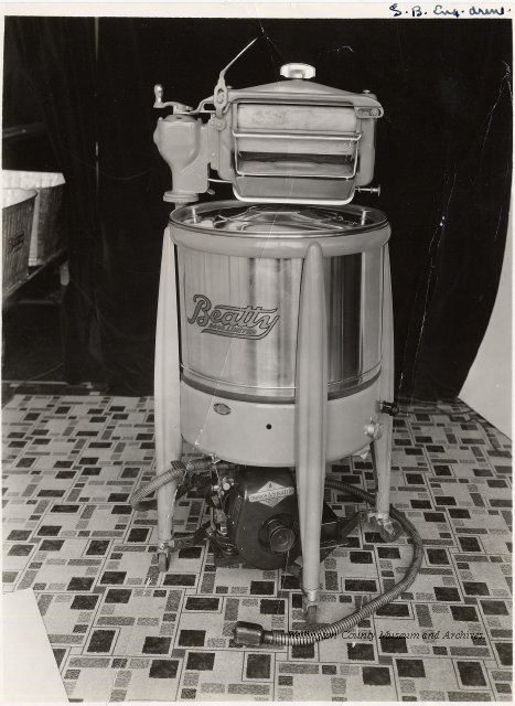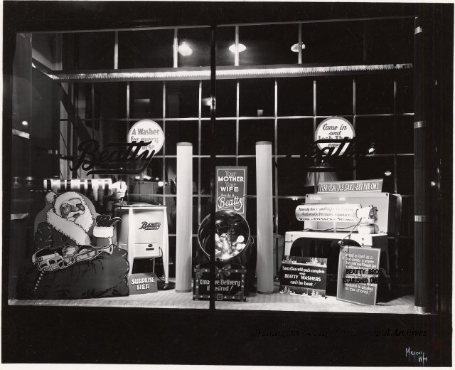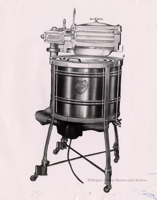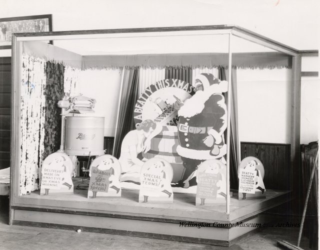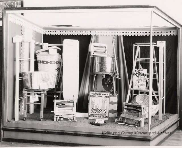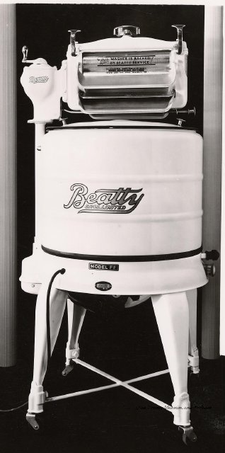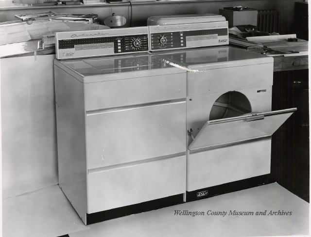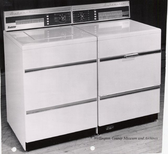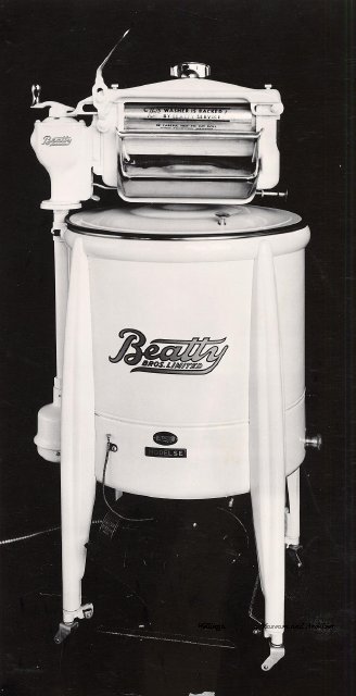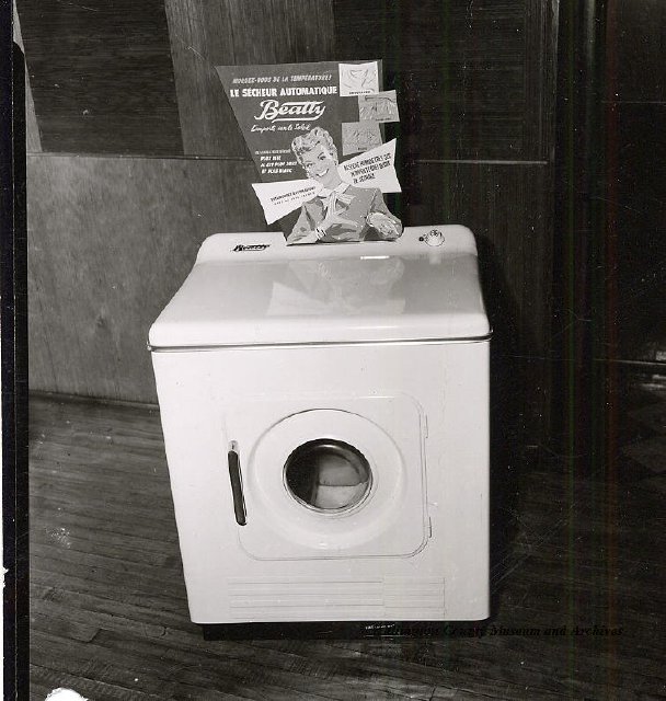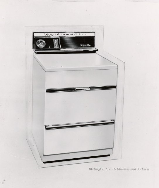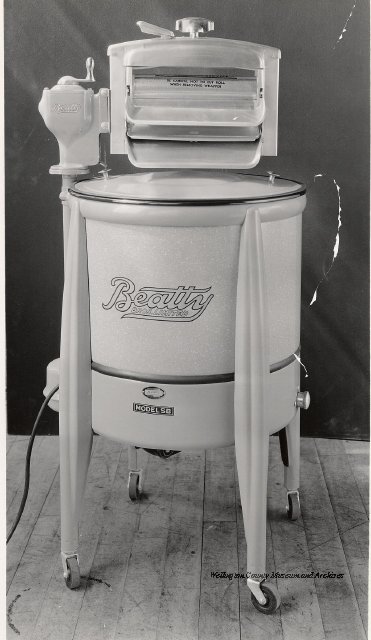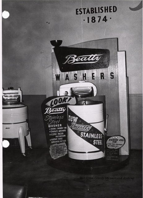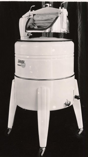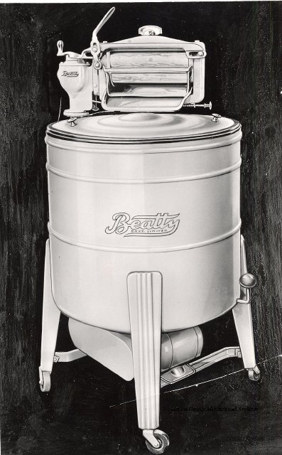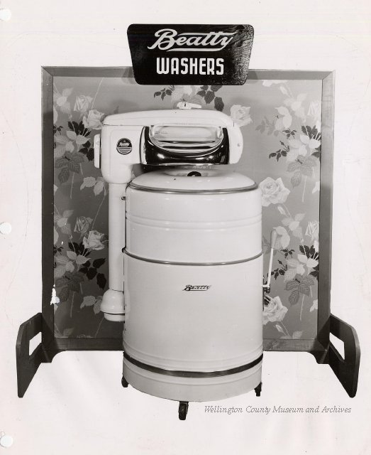 Beatty Bros., Fergus, Series 08, Photographs: Subseries 20, Washers, ph 26706 - ph 26803, ca.1900-ca.1960. Mainly 8"x 10" b&w prints, found loose; numbers in square brackets assigned by Beatty Bros: - ph 26706: 7 images, 1900 Cataract washer; woman model, dress with square neck, enhanced with rick-rack [zig-zag] design. - ph 26707: 10 images, 1900 Cataract washer; woman model. - ph 26708: 1900 Gravity washer, wooden tub. The Nineteen Hundred Washer Co., Toronto. - ph 26709: Woman model with wooden tub, engine drive. - ph 26710: Wooden tub, handle detail. - ph 26711: 2 views, Beatty hand washer with metal tub. One print: Walker's Studio, Brantford. - ph 26712: 4 images, 3 different women models with hand washer, metal tub. - ph 26713: 12 images, men and women on assembly line, working on Beatty "Economy" washer. - ph 26714: 32 images, man, woman (in dress with palm-tree pattern) and children, with Beatty automatic washer. Photos #46438; 47422-47509 [various]: Brigdens Limited., Toronto, ca.1950. - ph 26715: Model "8A / Economy" washer. - ph 26716: 6 images, woman model (with block-pattern dress) and "SB / Royal Family" washer, tubs, basket. - ph 26717: 2 images, Coronation / 1937 washer; woman with washer, tub, basket. - ph 26718: [T7097] 16 images, demonstration of Beatty automatic washer ("The greatest washer of all time"); some names, ca.1950. - ph 26719: 3 images, women and young women, demonstration of Beatty automatic washer, ca.1950. - ph 26720: Certificate, Quebec Exposition Provinciale, Medaille d'or to Beatty Bros. Ltd., for the third time, 7 Sept. 1927. - ph 26721: Certificate 1923-1924, Good Housekeeping Institute, Department of Household Engineering, to the "1900 Cataract" washer, manufactured by the Nineteen Hundred Washer Co; previously granted to them 1916-1923. - ph 26722: Parts list Model "SM" washer. - ph 26723: Parts list washer, unidentified. - ph 26724: 4 images, woman model and young boy with "White Cap" washer (which falls over). - ph 26725: 4 images, woman model with "Akka" top-flow washer; mechanism. Photos: Frank S. Lamia, Milwaukee, USA, ca.1945[?]. - ph 26726: Woman model with Beatty "Red Star" [hand powered] washer, ca.1930. - ph 26727: 2 images, wooden tub washers, Beatty, 1900. - ph 26728: 2 images, Beatty Model "SB" washer, engine drive, electric drive. - ph 26729: Genalex washer. - ph 26730: Beatty "Economy" washer. - ph 26731: Model "3B" washer. - ph 26732: Model "SE" engine drive washer. - ph 26733: 2 images, Beatty Model "FF" engine drive washer. - ph 26734: 2 images, Beatty copper-tub washers, electric drive, engine drive. - ph 26735: Beatty Model "SB" engine drive washer. - ph 26736: Woman model with tubs, stand and engine drive washer [unidentified]; battery in foreground. - ph 26737: Woman model with tubs, stand and electric drive washer [unidentified]. - ph 26738: Man with Beatty "Economy" washer next to "Bendix" automatic washer. - ph 26739: 5 images, woman model with copper-tub washer; young boy and girl with toy tubs, stand and baskets and ironing board; includes window display with advertising card "Helping Mother" showing child-sized tubs and stand, ironing board, baskets. - ph 26740: Woman with Model "M" washer, tubs and tub stand. - ph 26741: Woman carrying wicker laundry basket; next to Beatty automatic washer, ca.1950. - ph 26742: Woman model with Beatty washer [unidentified], basket, tub and stand. - ph 26743: Woman with Beatty washer [unidentified]; pile of laundry foreground. On reverse: "Mrs. H. King, Hotel Mount Royal, Mount Forest, Ont. (Mr. Oscar Hahn, prop.), April [19]46". - ph 26744: Woman with hands on agitators, between two Beatty washers. - ph 26745: Woman, next to washer, pouring water into container on "Hotpoint" stove. - ph 26746: 4-prong agitator, Beatty / BT "White Cap" washer. - ph 26747: Woman model with laundry rack, Beatty tubs and stand, washer and basket; ladder in background. - ph 26748: Beatty washer, Model unidentified. - ph 26749: Beatty Model "LRB"[?] washer. - ph 26750: Dominion - American jobbers washer. - ph 26751: Line drawing and blueprint, woman model with Beatty washer, tubs and stand, baskets, drying rack, ladder. - ph 26752: Paper print, woman with Beatty washer, tubs and stand, basket. - ph 26753: Advertisements, Beatty porcelain tank [tub] washer; Beatty automatic washer, 1940-1950. - ph 26754: 3 images, wringer mechanism. - ph 26755: Device for testing Beatty ball-bearings against plain bronze bearings. - ph 26756: "Beatty washer mechanisms on test benches where they are operated for more than one hour before inspection for building into the washer frame [undated]". - ph 26757: Line drawing for use with Model "8A" [washer?]. - ph 26758: Paper prints, advertisements, Toronto, Sherbrooke, Chatham, Kingston; includes cardboard printing matte; ca.1920-ca.1940. - ph 26759: 8 images, apparently related: "The Original Washboard" (includes close-up of woman kneeling, washing laundry); "Wash-board Second Stage"; men wringing laundry[?]; man and woman on front steps (he appears to be delivering laundry); "Half the Washing Still to Do at Home" (woman with laundry tub and washboard); truck with copper-tub washers, baskets, tubs, ladders; four women and 2 boys looking at copper-tub washer, ca.1930. - ph 26760: Colour print. Beatty porcelain tub washer, 1933. Removed from WGB [William G. Beatty] Historical File No.36. - ph 26761: Postcard. Beatty Automatic Washer Travel Show, Oct. 1951. Removed from Historical File, Box 76, No.1305: "Washer Travel Show". - ph 26762: Beatty washer referred to in test report 19 July 1939 to 9 Feb. 1946. Removed from Correspondence, Box 62, File 191, Engineering Experimental Data. - ph 26763: Wringer assembly. Removed from binder: "Photo-prints #8", ca.1960. - ph 26764: Beatty automatic washer. Removed from binder: "Photo-prints #8", ca.1960. - ph 26765: Automatic washer top surface, with pencil. Removed from binder: "Photo-prints #8", ca.1960. - ph 26766: Beatty "Cromatic" washer 