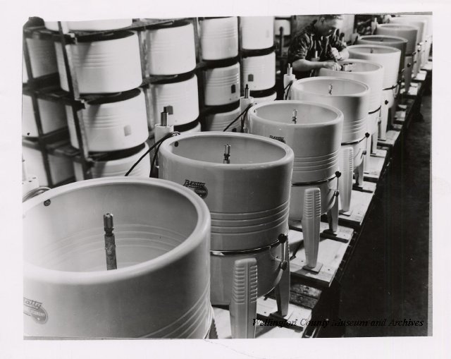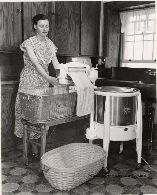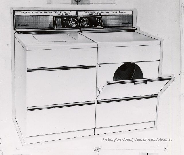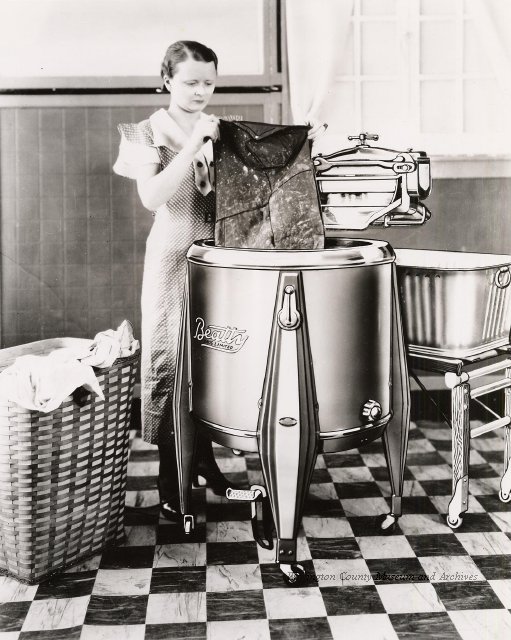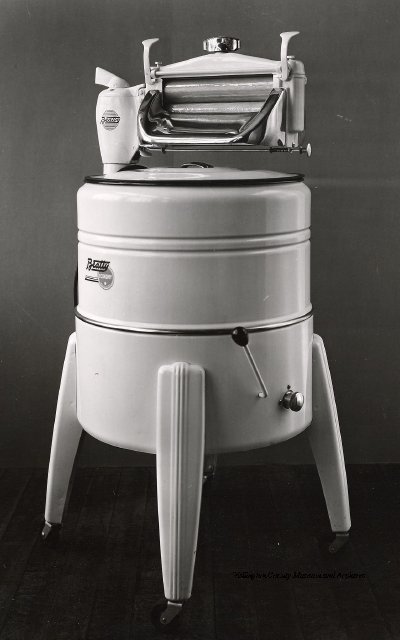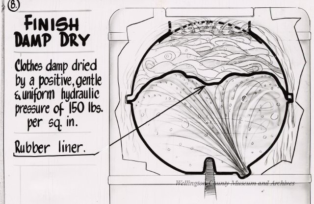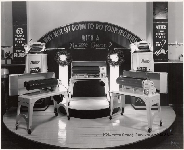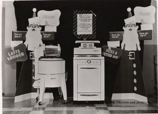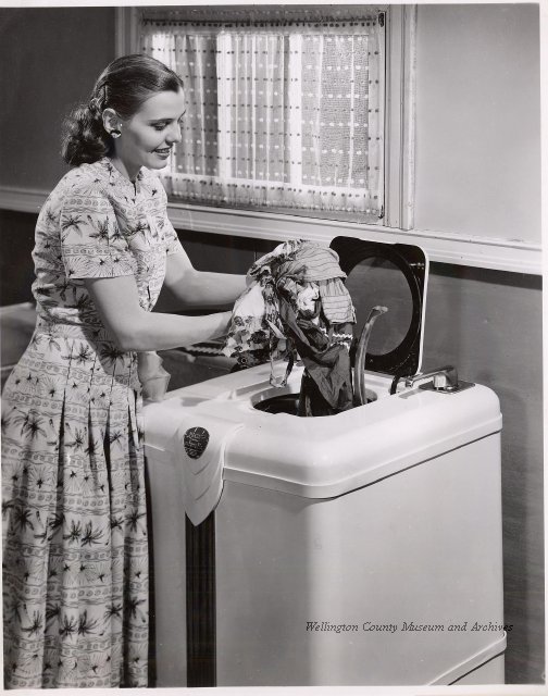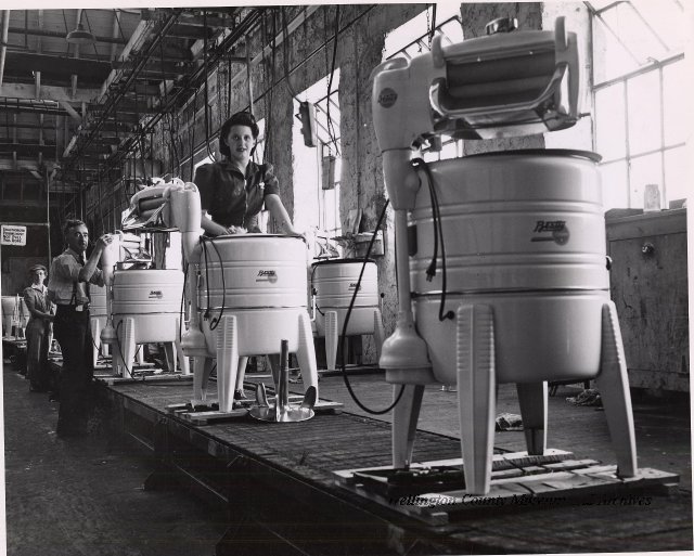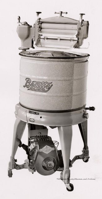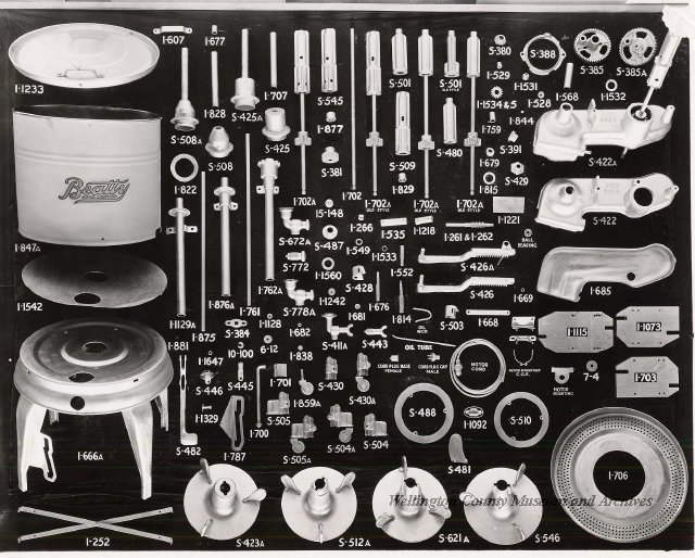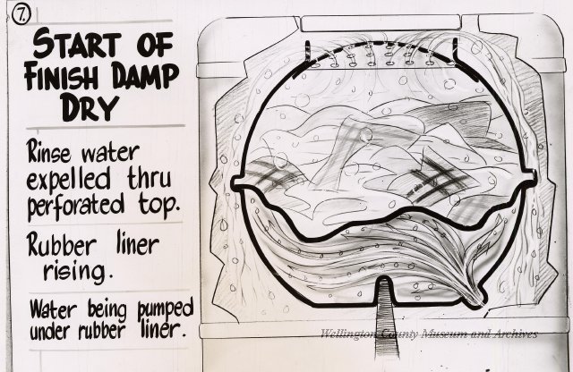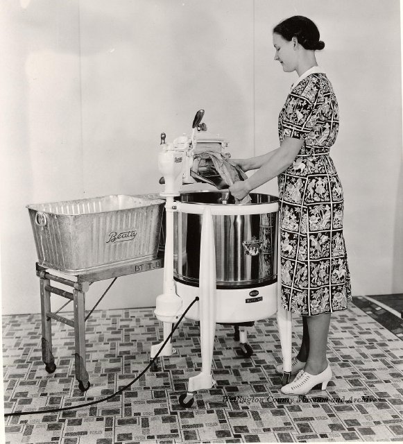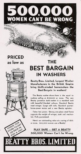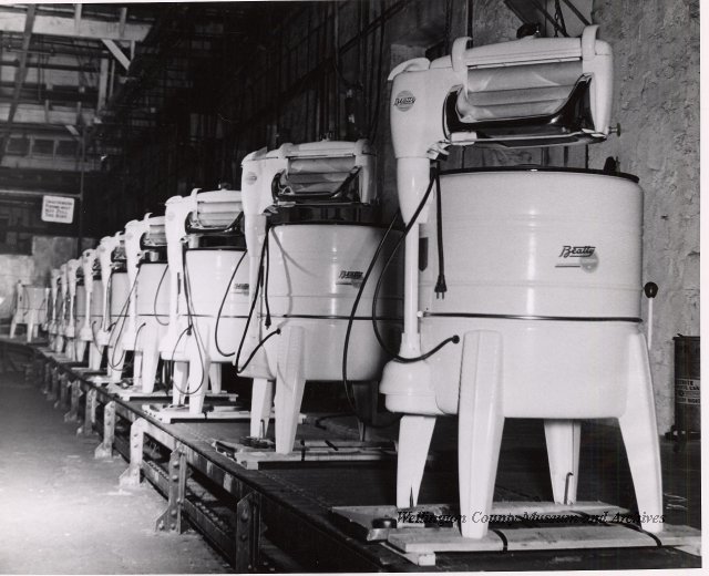 Beatty Bros., Fergus, Series 08, Photographs: Subseries 20, Washers, ph 26706 - ph 26803, ca.1900-ca.1960. Mainly 8"x 10" b&w prints, found loose; numbers in square brackets assigned by Beatty Bros: - ph 26706: 7 images, 1900 Cataract washer; woman model, dress with square neck, enhanced with rick-rack [zig-zag] design. - ph 26707: 10 images, 1900 Cataract washer; woman model. - ph 26708: 1900 Gravity washer, wooden tub. The Nineteen Hundred Washer Co., Toronto. - ph 26709: Woman model with wooden tub, engine drive. - ph 26710: Wooden tub, handle detail. - ph 26711: 2 views, Beatty hand washer with metal tub. One print: Walker's Studio, Brantford. - ph 26712: 4 images, 3 different women models with hand washer, metal tub. - ph 26713: 12 images, men and women on assembly line, working on Beatty "Economy" washer. - ph 26714: 32 images, man, woman (in dress with palm-tree pattern) and children, with Beatty automatic washer. Photos #46438; 47422-47509 [various]: Brigdens Limited., Toronto, ca.1950. - ph 26715: Model "8A / Economy" washer. - ph 26716: 6 images, woman model (with block-pattern dress) and "SB / Royal Family" washer, tubs, basket. - ph 26717: 2 images, Coronation / 1937 washer; woman with washer, tub, basket. - ph 26718: [T7097] 16 images, demonstration of Beatty automatic washer ("The greatest washer of all time"); some names, ca.1950. - ph 26719: 3 images, women and young women, demonstration of Beatty automatic washer, ca.1950. - ph 26720: Certificate, Quebec Exposition Provinciale, Medaille d'or to Beatty Bros. Ltd., for the third time, 7 Sept. 1927. - ph 26721: Certificate 1923-1924, Good Housekeeping Institute, Department of Household Engineering, to the "1900 Cataract" washer, manufactured by the Nineteen Hundred Washer Co; previously granted to them 1916-1923. - ph 26722: Parts list Model "SM" washer. - ph 26723: Parts list washer, unidentified. - ph 26724: 4 images, woman model and young boy with "White Cap" washer (which falls over). - ph 26725: 4 images, woman model with "Akka" top-flow washer; mechanism. Photos: Frank S. Lamia, Milwaukee, USA, ca.1945[?]. - ph 26726: Woman model with Beatty "Red Star" [hand powered] washer, ca.1930. - ph 26727: 2 images, wooden tub washers, Beatty, 1900. - ph 26728: 2 images, Beatty Model "SB" washer, engine drive, electric drive. - ph 26729: Genalex washer. - ph 26730: Beatty "Economy" washer. - ph 26731: Model "3B" washer. - ph 26732: Model "SE" engine drive washer. - ph 26733: 2 images, Beatty Model "FF" engine drive washer. - ph 26734: 2 images, Beatty copper-tub washers, electric drive, engine drive. - ph 26735: Beatty Model "SB" engine drive washer. - ph 26736: Woman model with tubs, stand and engine drive washer [unidentified]; battery in foreground. - ph 26737: Woman model with tubs, stand and electric drive washer [unidentified]. - ph 26738: Man with Beatty "Economy" washer next to "Bendix" automatic washer. - ph 26739: 5 images, woman model with copper-tub washer; young boy and girl with toy tubs, stand and baskets and ironing board; includes window display with advertising card "Helping Mother" showing child-sized tubs and stand, ironing board, baskets. - ph 26740: Woman with Model "M" washer, tubs and tub stand. - ph 26741: Woman carrying wicker laundry basket; next to Beatty automatic washer, ca.1950. - ph 26742: Woman model with Beatty washer [unidentified], basket, tub and stand. - ph 26743: Woman with Beatty washer [unidentified]; pile of laundry foreground. On reverse: "Mrs. H. King, Hotel Mount Royal, Mount Forest, Ont. (Mr. Oscar Hahn, prop.), April [19]46". - ph 26744: Woman with hands on agitators, between two Beatty washers. - ph 26745: Woman, next to washer, pouring water into container on "Hotpoint" stove. - ph 26746: 4-prong agitator, Beatty / BT "White Cap" washer. - ph 26747: Woman model with laundry rack, Beatty tubs and stand, washer and basket; ladder in background. - ph 26748: Beatty washer, Model unidentified. - ph 26749: Beatty Model "LRB"[?] washer. - ph 26750: Dominion - American jobbers washer. - ph 26751: Line drawing and blueprint, woman model with Beatty washer, tubs and stand, baskets, drying rack, ladder. - ph 26752: Paper print, woman with Beatty washer, tubs and stand, basket. - ph 26753: Advertisements, Beatty porcelain tank [tub] washer; Beatty automatic washer, 1940-1950. - ph 26754: 3 images, wringer mechanism. - ph 26755: Device for testing Beatty ball-bearings against plain bronze bearings. - ph 26756: "Beatty washer mechanisms on test benches where they are operated for more than one hour before inspection for building into the washer frame [undated]". - ph 26757: Line drawing for use with Model "8A" [washer?]. - ph 26758: Paper prints, advertisements, Toronto, Sherbrooke, Chatham, Kingston; includes cardboard printing matte; ca.1920-ca.1940. - ph 26759: 8 images, apparently related: "The Original Washboard" (includes close-up of woman kneeling, washing laundry); "Wash-board Second Stage"; men wringing laundry[?]; man and woman on front steps (he appears to be delivering laundry); "Half the Washing Still to Do at Home" (woman with laundry tub and washboard); truck with copper-tub washers, baskets, tubs, ladders; four women and 2 boys looking at copper-tub washer, ca.1930. - ph 26760: Colour print. Beatty porcelain tub washer, 1933. Removed from WGB [William G. Beatty] Historical File No.36. - ph 26761: Postcard. Beatty Automatic Washer Travel Show, Oct. 1951. Removed from Historical File, Box 76, No.1305: "Washer Travel Show". - ph 26762: Beatty washer referred to in test report 19 July 1939 to 9 Feb. 1946. Removed from Correspondence, Box 62, File 191, Engineering Experimental Data. - ph 26763: Wringer assembly. Removed from binder: "Photo-prints #8", ca.1960. - ph 26764: Beatty automatic washer. Removed from binder: "Photo-prints #8", ca.1960. - ph 26765: Automatic washer top surface, with pencil. Removed from binder: "Photo-prints #8", ca.1960. - ph 26766: Beatty "Cromatic" washer 