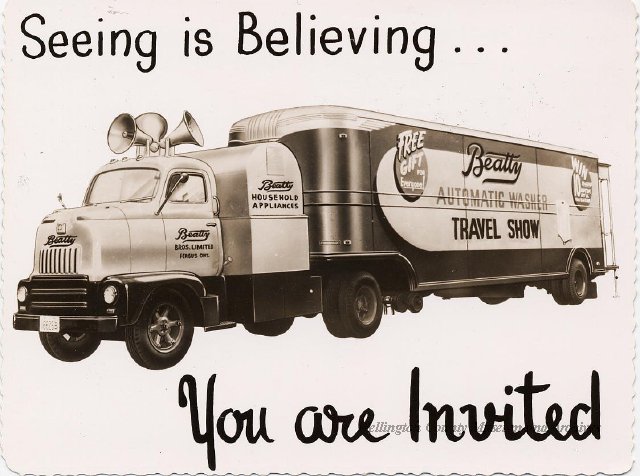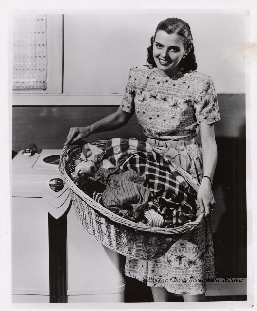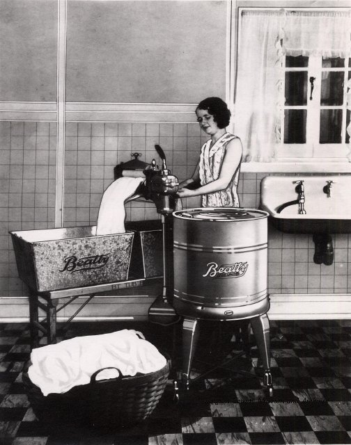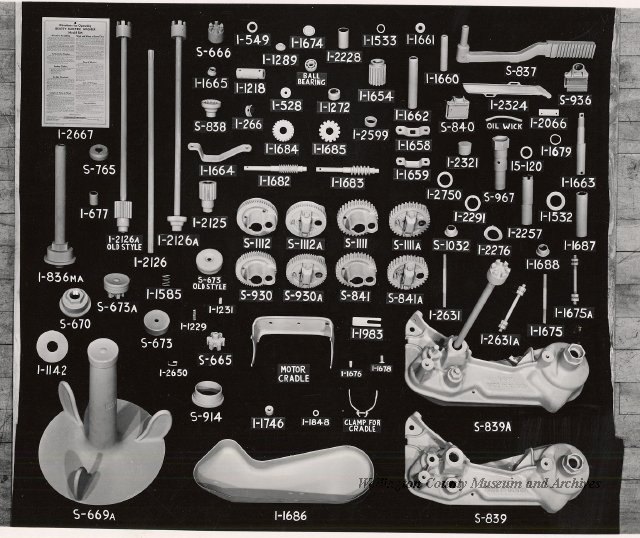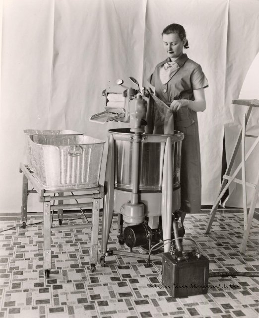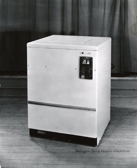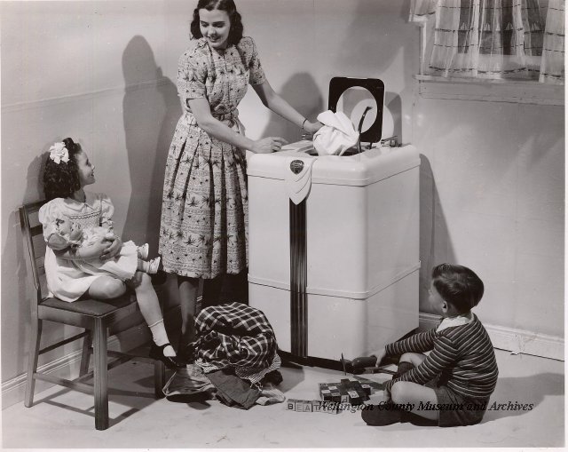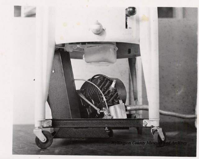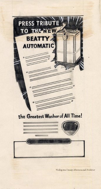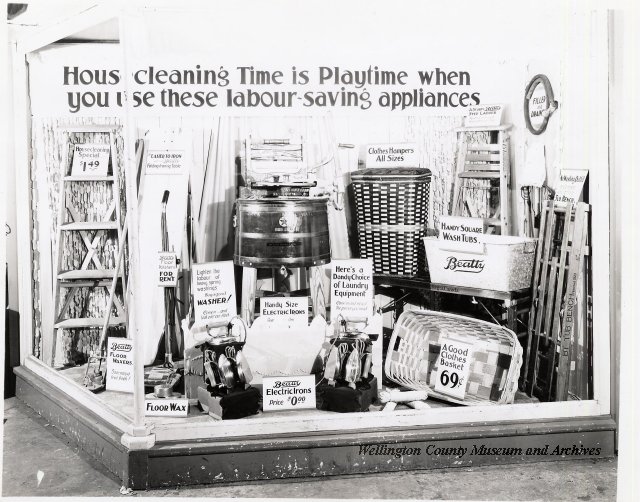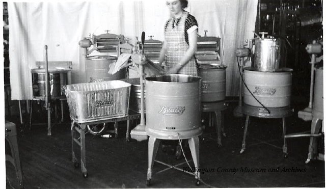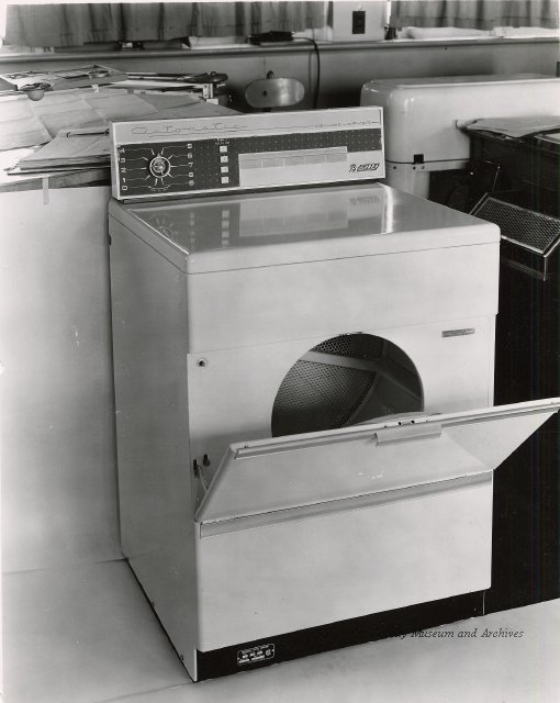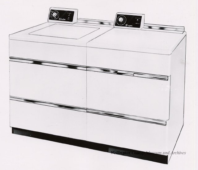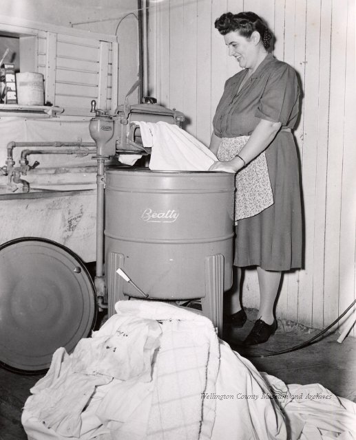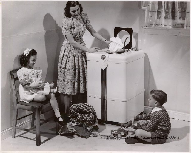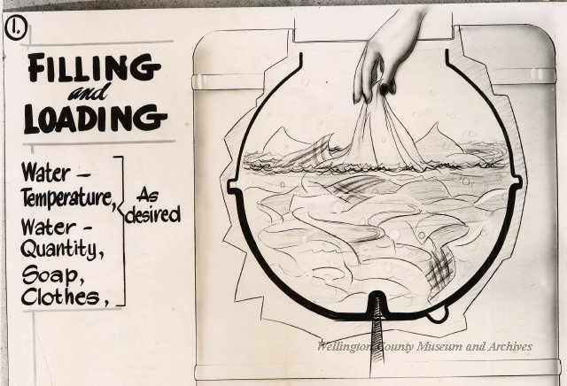 Beatty Bros., Fergus, Series 08, Photographs: Subseries 20, Washers, ph 26706 - ph 26803, ca.1900-ca.1960. Mainly 8"x 10" b&w prints, found loose; numbers in square brackets assigned by Beatty Bros: - ph 26706: 7 images, 1900 Cataract washer; woman model, dress with square neck, enhanced with rick-rack [zig-zag] design. - ph 26707: 10 images, 1900 Cataract washer; woman model. - ph 26708: 1900 Gravity washer, wooden tub. The Nineteen Hundred Washer Co., Toronto. - ph 26709: Woman model with wooden tub, engine drive. - ph 26710: Wooden tub, handle detail. - ph 26711: 2 views, Beatty hand washer with metal tub. One print: Walker's Studio, Brantford. - ph 26712: 4 images, 3 different women models with hand washer, metal tub. - ph 26713: 12 images, men and women on assembly line, working on Beatty "Economy" washer. - ph 26714: 32 images, man, woman (in dress with palm-tree pattern) and children, with Beatty automatic washer. Photos #46438; 47422-47509 [various]: Brigdens Limited., Toronto, ca.1950. - ph 26715: Model "8A / Economy" washer. - ph 26716: 6 images, woman model (with block-pattern dress) and "SB / Royal Family" washer, tubs, basket. - ph 26717: 2 images, Coronation / 1937 washer; woman with washer, tub, basket. - ph 26718: [T7097] 16 images, demonstration of Beatty automatic washer ("The greatest washer of all time"); some names, ca.1950. - ph 26719: 3 images, women and young women, demonstration of Beatty automatic washer, ca.1950. - ph 26720: Certificate, Quebec Exposition Provinciale, Medaille d'or to Beatty Bros. Ltd., for the third time, 7 Sept. 1927. - ph 26721: Certificate 1923-1924, Good Housekeeping Institute, Department of Household Engineering, to the "1900 Cataract" washer, manufactured by the Nineteen Hundred Washer Co; previously granted to them 1916-1923. - ph 26722: Parts list Model "SM" washer. - ph 26723: Parts list washer, unidentified. - ph 26724: 4 images, woman model and young boy with "White Cap" washer (which falls over). - ph 26725: 4 images, woman model with "Akka" top-flow washer; mechanism. Photos: Frank S. Lamia, Milwaukee, USA, ca.1945[?]. - ph 26726: Woman model with Beatty "Red Star" [hand powered] washer, ca.1930. - ph 26727: 2 images, wooden tub washers, Beatty, 1900. - ph 26728: 2 images, Beatty Model "SB" washer, engine drive, electric drive. - ph 26729: Genalex washer. - ph 26730: Beatty "Economy" washer. - ph 26731: Model "3B" washer. - ph 26732: Model "SE" engine drive washer. - ph 26733: 2 images, Beatty Model "FF" engine drive washer. - ph 26734: 2 images, Beatty copper-tub washers, electric drive, engine drive. - ph 26735: Beatty Model "SB" engine drive washer. - ph 26736: Woman model with tubs, stand and engine drive washer [unidentified]; battery in foreground. - ph 26737: Woman model with tubs, stand and electric drive washer [unidentified]. - ph 26738: Man with Beatty "Economy" washer next to "Bendix" automatic washer. - ph 26739: 5 images, woman model with copper-tub washer; young boy and girl with toy tubs, stand and baskets and ironing board; includes window display with advertising card "Helping Mother" showing child-sized tubs and stand, ironing board, baskets. - ph 26740: Woman with Model "M" washer, tubs and tub stand. - ph 26741: Woman carrying wicker laundry basket; next to Beatty automatic washer, ca.1950. - ph 26742: Woman model with Beatty washer [unidentified], basket, tub and stand. - ph 26743: Woman with Beatty washer [unidentified]; pile of laundry foreground. On reverse: "Mrs. H. King, Hotel Mount Royal, Mount Forest, Ont. (Mr. Oscar Hahn, prop.), April [19]46". - ph 26744: Woman with hands on agitators, between two Beatty washers. - ph 26745: Woman, next to washer, pouring water into container on "Hotpoint" stove. - ph 26746: 4-prong agitator, Beatty / BT "White Cap" washer. - ph 26747: Woman model with laundry rack, Beatty tubs and stand, washer and basket; ladder in background. - ph 26748: Beatty washer, Model unidentified. - ph 26749: Beatty Model "LRB"[?] washer. - ph 26750: Dominion - American jobbers washer. - ph 26751: Line drawing and blueprint, woman model with Beatty washer, tubs and stand, baskets, drying rack, ladder. - ph 26752: Paper print, woman with Beatty washer, tubs and stand, basket. - ph 26753: Advertisements, Beatty porcelain tank [tub] washer; Beatty automatic washer, 1940-1950. - ph 26754: 3 images, wringer mechanism. - ph 26755: Device for testing Beatty ball-bearings against plain bronze bearings. - ph 26756: "Beatty washer mechanisms on test benches where they are operated for more than one hour before inspection for building into the washer frame [undated]". - ph 26757: Line drawing for use with Model "8A" [washer?]. - ph 26758: Paper prints, advertisements, Toronto, Sherbrooke, Chatham, Kingston; includes cardboard printing matte; ca.1920-ca.1940. - ph 26759: 8 images, apparently related: "The Original Washboard" (includes close-up of woman kneeling, washing laundry); "Wash-board Second Stage"; men wringing laundry[?]; man and woman on front steps (he appears to be delivering laundry); "Half the Washing Still to Do at Home" (woman with laundry tub and washboard); truck with copper-tub washers, baskets, tubs, ladders; four women and 2 boys looking at copper-tub washer, ca.1930. - ph 26760: Colour print. Beatty porcelain tub washer, 1933. Removed from WGB [William G. Beatty] Historical File No.36. - ph 26761: Postcard. Beatty Automatic Washer Travel Show, Oct. 1951. Removed from Historical File, Box 76, No.1305: "Washer Travel Show". - ph 26762: Beatty washer referred to in test report 19 July 1939 to 9 Feb. 1946. Removed from Correspondence, Box 62, File 191, Engineering Experimental Data. - ph 26763: Wringer assembly. Removed from binder: "Photo-prints #8", ca.1960. - ph 26764: Beatty automatic washer. Removed from binder: "Photo-prints #8", ca.1960. - ph 26765: Automatic washer top surface, with pencil. Removed from binder: "Photo-prints #8", ca.1960. - ph 26766: Beatty "Cromatic" washer 