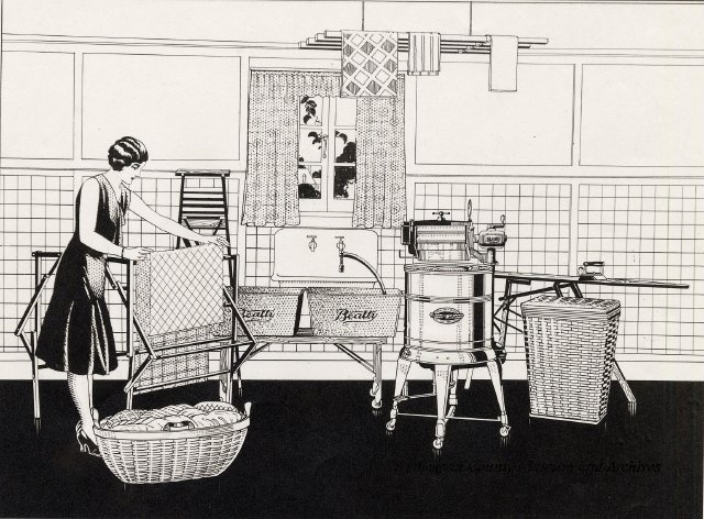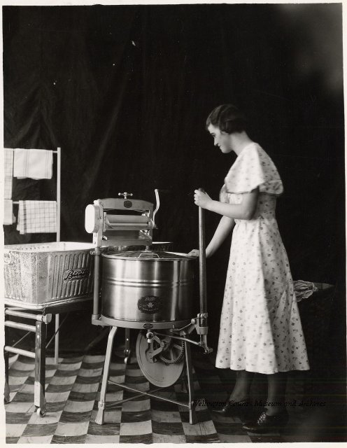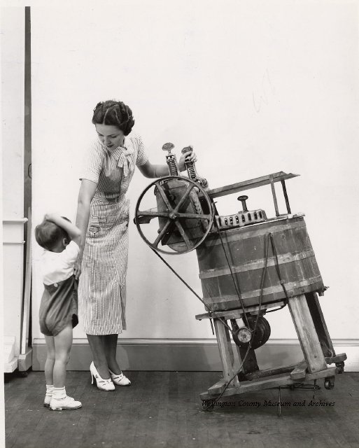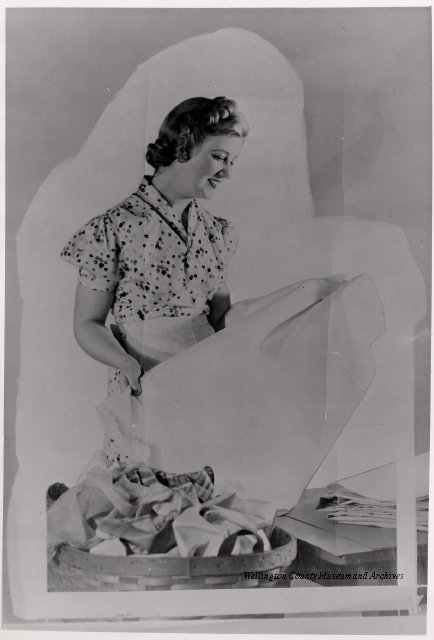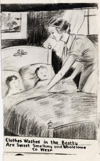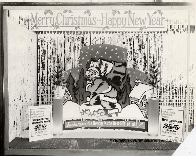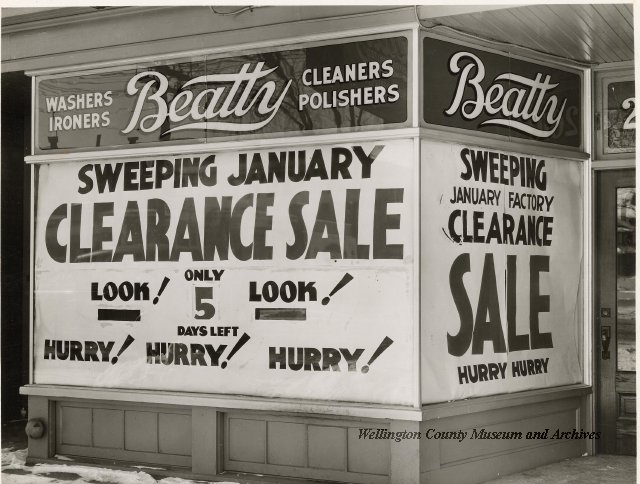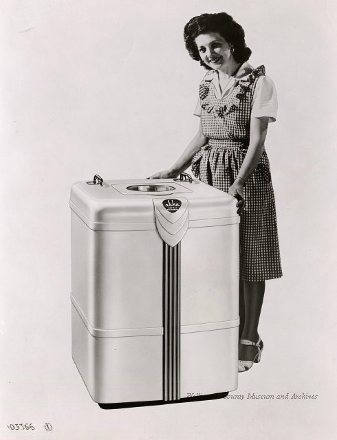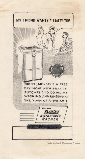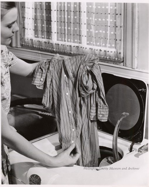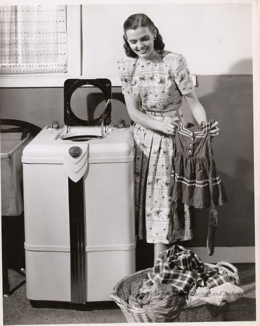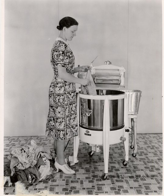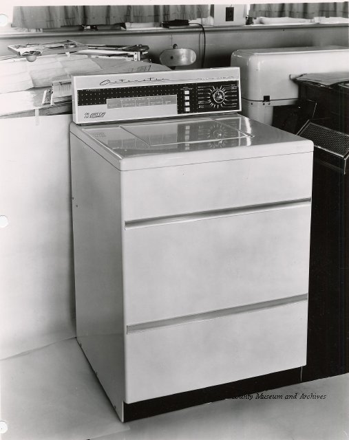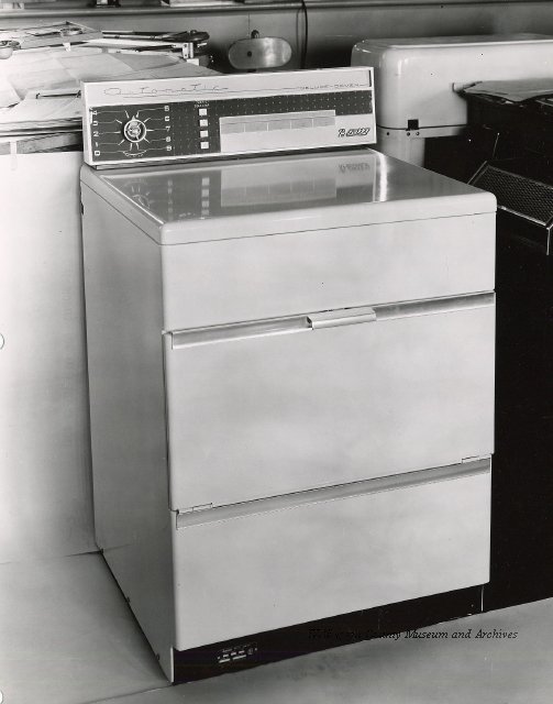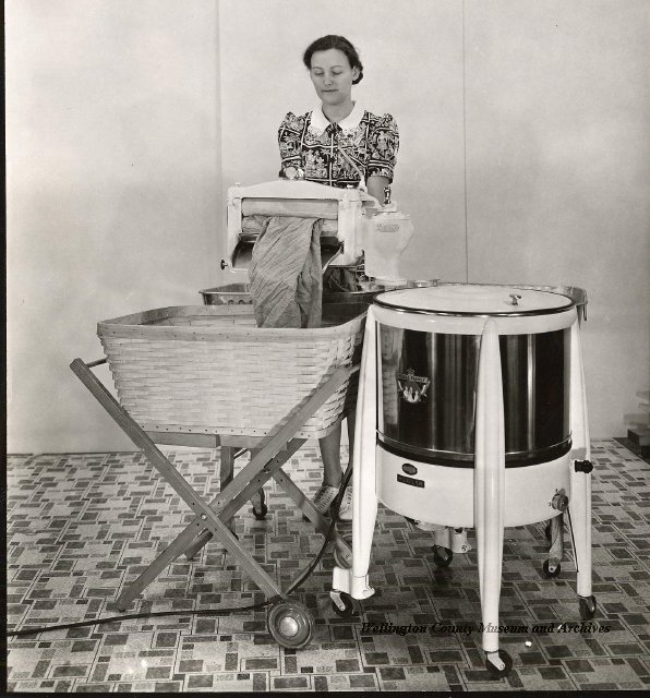 Beatty Bros., Fergus, Series 08, Photographs: Subseries 20, Washers, ph 26706 - ph 26803, ca.1900-ca.1960. Mainly 8"x 10" b&w prints, found loose; numbers in square brackets assigned by Beatty Bros: - ph 26706: 7 images, 1900 Cataract washer; woman model, dress with square neck, enhanced with rick-rack [zig-zag] design. - ph 26707: 10 images, 1900 Cataract washer; woman model. - ph 26708: 1900 Gravity washer, wooden tub. The Nineteen Hundred Washer Co., Toronto. - ph 26709: Woman model with wooden tub, engine drive. - ph 26710: Wooden tub, handle detail. - ph 26711: 2 views, Beatty hand washer with metal tub. One print: Walker's Studio, Brantford. - ph 26712: 4 images, 3 different women models with hand washer, metal tub. - ph 26713: 12 images, men and women on assembly line, working on Beatty "Economy" washer. - ph 26714: 32 images, man, woman (in dress with palm-tree pattern) and children, with Beatty automatic washer. Photos #46438; 47422-47509 [various]: Brigdens Limited., Toronto, ca.1950. - ph 26715: Model "8A / Economy" washer. - ph 26716: 6 images, woman model (with block-pattern dress) and "SB / Royal Family" washer, tubs, basket. - ph 26717: 2 images, Coronation / 1937 washer; woman with washer, tub, basket. - ph 26718: [T7097] 16 images, demonstration of Beatty automatic washer ("The greatest washer of all time"); some names, ca.1950. - ph 26719: 3 images, women and young women, demonstration of Beatty automatic washer, ca.1950. - ph 26720: Certificate, Quebec Exposition Provinciale, Medaille d'or to Beatty Bros. Ltd., for the third time, 7 Sept. 1927. - ph 26721: Certificate 1923-1924, Good Housekeeping Institute, Department of Household Engineering, to the "1900 Cataract" washer, manufactured by the Nineteen Hundred Washer Co; previously granted to them 1916-1923. - ph 26722: Parts list Model "SM" washer. - ph 26723: Parts list washer, unidentified. - ph 26724: 4 images, woman model and young boy with "White Cap" washer (which falls over). - ph 26725: 4 images, woman model with "Akka" top-flow washer; mechanism. Photos: Frank S. Lamia, Milwaukee, USA, ca.1945[?]. - ph 26726: Woman model with Beatty "Red Star" [hand powered] washer, ca.1930. - ph 26727: 2 images, wooden tub washers, Beatty, 1900. - ph 26728: 2 images, Beatty Model "SB" washer, engine drive, electric drive. - ph 26729: Genalex washer. - ph 26730: Beatty "Economy" washer. - ph 26731: Model "3B" washer. - ph 26732: Model "SE" engine drive washer. - ph 26733: 2 images, Beatty Model "FF" engine drive washer. - ph 26734: 2 images, Beatty copper-tub washers, electric drive, engine drive. - ph 26735: Beatty Model "SB" engine drive washer. - ph 26736: Woman model with tubs, stand and engine drive washer [unidentified]; battery in foreground. - ph 26737: Woman model with tubs, stand and electric drive washer [unidentified]. - ph 26738: Man with Beatty "Economy" washer next to "Bendix" automatic washer. - ph 26739: 5 images, woman model with copper-tub washer; young boy and girl with toy tubs, stand and baskets and ironing board; includes window display with advertising card "Helping Mother" showing child-sized tubs and stand, ironing board, baskets. - ph 26740: Woman with Model "M" washer, tubs and tub stand. - ph 26741: Woman carrying wicker laundry basket; next to Beatty automatic washer, ca.1950. - ph 26742: Woman model with Beatty washer [unidentified], basket, tub and stand. - ph 26743: Woman with Beatty washer [unidentified]; pile of laundry foreground. On reverse: "Mrs. H. King, Hotel Mount Royal, Mount Forest, Ont. (Mr. Oscar Hahn, prop.), April [19]46". - ph 26744: Woman with hands on agitators, between two Beatty washers. - ph 26745: Woman, next to washer, pouring water into container on "Hotpoint" stove. - ph 26746: 4-prong agitator, Beatty / BT "White Cap" washer. - ph 26747: Woman model with laundry rack, Beatty tubs and stand, washer and basket; ladder in background. - ph 26748: Beatty washer, Model unidentified. - ph 26749: Beatty Model "LRB"[?] washer. - ph 26750: Dominion - American jobbers washer. - ph 26751: Line drawing and blueprint, woman model with Beatty washer, tubs and stand, baskets, drying rack, ladder. - ph 26752: Paper print, woman with Beatty washer, tubs and stand, basket. - ph 26753: Advertisements, Beatty porcelain tank [tub] washer; Beatty automatic washer, 1940-1950. - ph 26754: 3 images, wringer mechanism. - ph 26755: Device for testing Beatty ball-bearings against plain bronze bearings. - ph 26756: "Beatty washer mechanisms on test benches where they are operated for more than one hour before inspection for building into the washer frame [undated]". - ph 26757: Line drawing for use with Model "8A" [washer?]. - ph 26758: Paper prints, advertisements, Toronto, Sherbrooke, Chatham, Kingston; includes cardboard printing matte; ca.1920-ca.1940. - ph 26759: 8 images, apparently related: "The Original Washboard" (includes close-up of woman kneeling, washing laundry); "Wash-board Second Stage"; men wringing laundry[?]; man and woman on front steps (he appears to be delivering laundry); "Half the Washing Still to Do at Home" (woman with laundry tub and washboard); truck with copper-tub washers, baskets, tubs, ladders; four women and 2 boys looking at copper-tub washer, ca.1930. - ph 26760: Colour print. Beatty porcelain tub washer, 1933. Removed from WGB [William G. Beatty] Historical File No.36. - ph 26761: Postcard. Beatty Automatic Washer Travel Show, Oct. 1951. Removed from Historical File, Box 76, No.1305: "Washer Travel Show". - ph 26762: Beatty washer referred to in test report 19 July 1939 to 9 Feb. 1946. Removed from Correspondence, Box 62, File 191, Engineering Experimental Data. - ph 26763: Wringer assembly. Removed from binder: "Photo-prints #8", ca.1960. - ph 26764: Beatty automatic washer. Removed from binder: "Photo-prints #8", ca.1960. - ph 26765: Automatic washer top surface, with pencil. Removed from binder: "Photo-prints #8", ca.1960. - ph 26766: Beatty "Cromatic" washer 