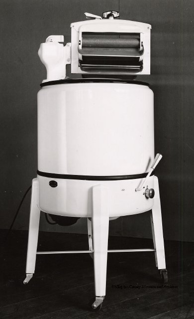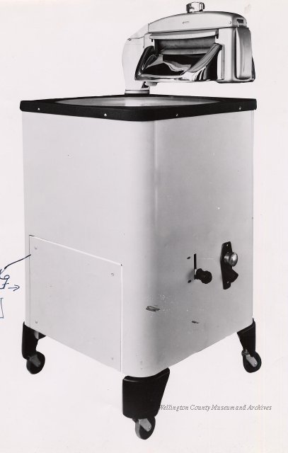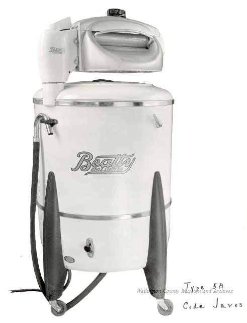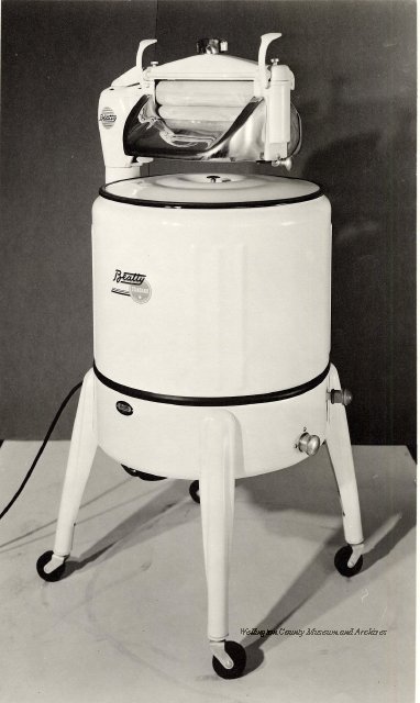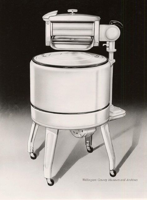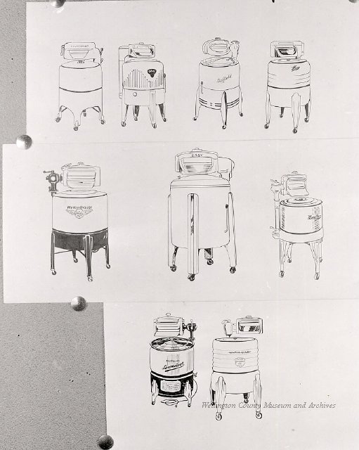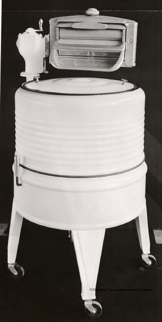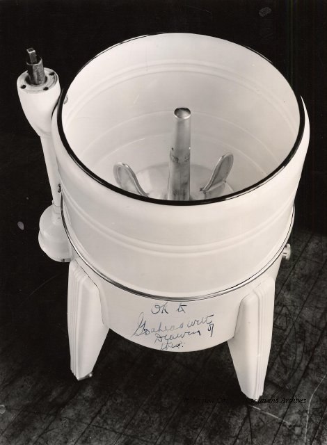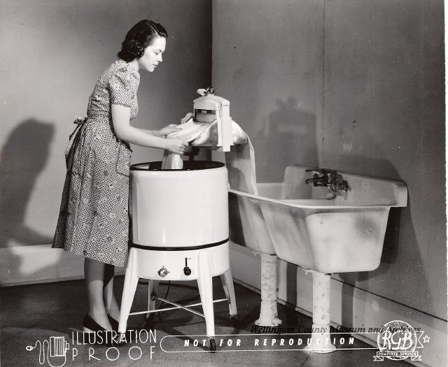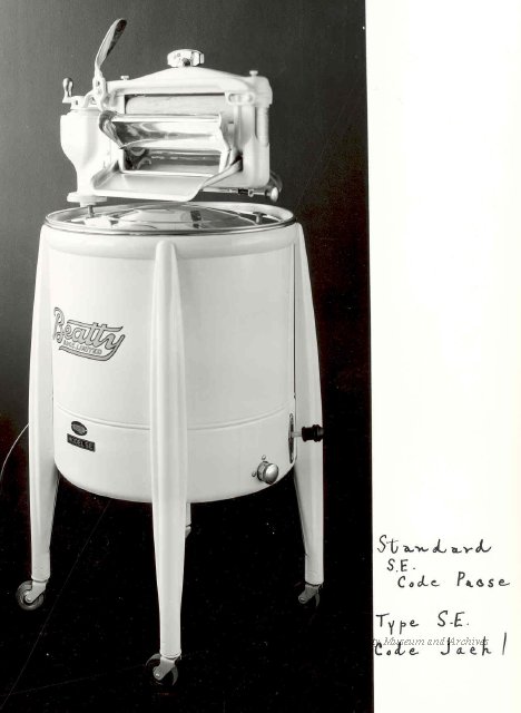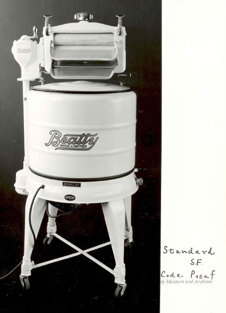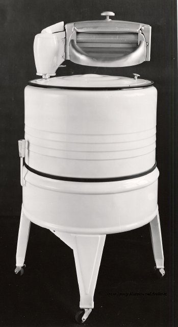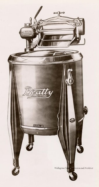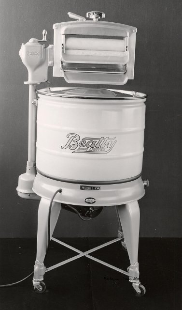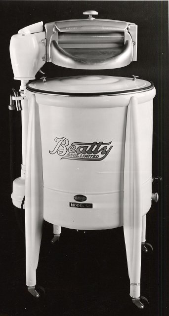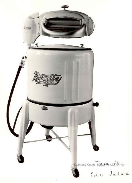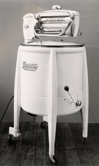 Beatty Bros., Fergus, Series 08, Photographs: Subseries 20, Washers, ph 26594 - ph 26705, 1939-ca.1950. Beatty Bros., Fergus, Series 08, Photographs: Subseries 20, Washers, ph 26594 - ph 26705, 1939-ca.1950. Mainly 8"x 10" b&w prints, removed from the photograph files indicated, numbered 5-90, and variously titled, and from file "Historical File No.979 - Beatty Washers / Photos". Photos are listed in the order of the files in which they were found. - ph 26594: Cutout, washer unidentified. Removed from file: "57. [Model] "2A" washer - photo file". - ph 26595: 2 images, Model "SE" [with different wringers]; one print with text on reverse: "Model 'SE' with pump for Spilhaus & Co., Capetown, S. Africa". Removed from file: "58. Export washers, photograph file". - ph 26596: [photo 10341 / neg.5949] Model " SE" washer (export) for S. Africa with Lovell wringer. Removed from file: "58. Export washers, photograph file". - ph 26597: Model "1A / Madeleine" for export. Removed from file: "58. Export washers, photograph file". - ph 26598: Model "SB" washer. Removed from file: "58. Export washers, photograph file". - ph 26599: 3 images, Model "Genalex" washer. Removed from file: "58. Export washers, photograph file". - ph 26600: Model "4A / Standard" washer. Removed from file: "58. Export washers, photograph file". - ph 26601: Model "ESB" engine drive washer. Removed from file: "58. Export washers, photograph file". - ph 26602: View into tub, Model "5A" washer. Removed from file: "58. Export washers, photograph file". - ph 26603: Dominion "Streamliner" washer. Removed from file: "58. Export washers, photograph file". - ph 26604: Portrait, 3/4 length, of King George and Queen Elizabeth, ca.1939. Removed from file: "58. Export washers, photograph file". - ph 26605: 5 images, man and woman with young boy and girl, and washer; in studio setting. Removed from file: "58. Export washers, photograph file". - ph 26606: 4-view sheet, hands with tools. Removed from file: "58. Export washers, photograph file". - ph 26607: Washer ["3A"?] with many vertical ribs on tub [unidentified]. Removed from file: "58. Export washers, photograph file". - ph 26608: 2 views, unidentified washer. Removed from file: "58. Export washers, photograph file". - ph 26609: 6 views, unidentified washers. Removed from file: "58. Export washers, photograph file". File: "60. Model "H" Hand washers, sample photo file" [EMPTY]. - ph 26610: Woman model / negative images]. Removed from file: "62. Washer Model "E". - ph 26611: 2 images, detail; men standing on washer drum/tub; [see also Model "M", file 65. Removed from file: "62. Washer Model "E". - ph 26612: Model "E". Removed from file: "62. Washer Model "E". - ph 26613: 2 men and woman with hat, with washer Model "E". Removed from file: "62. Washer Model "E". - ph 26614: Woman with Model "E" washer. Removed from file: "62. Washer Model "E". - ph 26615: Shaft and belt-driven laundry; Photo: Pringle & Booth, Toronto. Removed from file: "63. Old methods of washing". - ph 26616: Removed from file: "63. Old methods of washing". - ph 26617: 2 images within circle: woman with washtub and washboard, child. Removed from file: "63. Old methods of washing". - ph 26618: Model "R" washer. Removed from file: "64. Washer Model "R". - ph 26619: Closeup views, underneath of Model "M" [see also Model "E", file 62]. Removed from file: "65. Washer Model "M". - ph 26620: 2 views, Model "M" washer. Removed from file: "65. Washer Model "M". - ph 26621: Close-up, control handle. Removed from file: "65. Washer Model "M". - ph 26622: Woman model, with washer, laundry tubs, bench, basket. Removed from file: "65. Washer Model "M". - ph 26623: Washers lined up; overhead view into tub. Removed from file: "69. Washers - misc...". - ph 26624: Cutout, Model "Genalex" washer. Removed from file: "69. Washers - misc...". - ph 26625: 9 images, Beatty washer in institution with children; Eatonia wringer. Photos: Andre G. de Tonnancour, Montreal. - ph 26626: 2 images of washer, "not to be used for advertising or selling purposes / See Fred Armour, Engineering Dept. ... for E. Stevenson (W. Golightly), 4 July /39. Removed from file: "69. Washers - misc...". - ph 26627: Early washer; laundry tubs and washboards at right of image. Removed from file: "69. Washers - misc...". - ph 26628: "Graveyard at Toronto washer store". Removed from file: "69. Washers - misc...". - ph 26629: Woman model with washer, tubs, basket. Removed from file: "69. Washers - misc...". - ph 26630: Man in judge's robes[?]. Removed from file: "69. Washers - misc...". - ph 26631: Woman's hands and watch. Removed from file: "69. Washers - misc...". - ph 26632: Woman model with washer, young boy. Removed from file: "69. Washers - misc...". - ph 26633: Multi-views of women models. Removed from file: "69. Washers - misc...". - ph 26634: Line drawings, for washing machine advertisement[?]. Removed from file: "69. Washers - misc...". - ph 26635: Line drawings for washing machine advertisement[?]. Removed from file: "74. "Time Saver" & "White Cap". - ph 26636: Woman model holding curtains. Removed from: "75. Laundry illustrations ...". - ph 26637: Coloured illustration of King George and Queen Elizabeth with the Princesses Elizabeth and Margaret; see ph XXXXX. Removed from file: "76. Royal family washer illustrations". - ph 26637a: Sketch of King George and Queen Elizabeth with the Princesses Elizabeth and Margaret. - ph 26638: 2 images, woman with block-pattern dress, with Model "8A" and "8B" washers. Removed from file: "79. Model "8A" electric and engine drive washer, photograph file". - ph 26639: 3 images, man with electric motor and gasoline engine; close-up of bottom plate. Removed from file: "79. Model "8A" electric and engine drive washer, photograph file". - ph 26640: "Standard" / Model "8A"[?] washer. Removed from file: "79. Model "8A" electric and engine drive washer, photograph file". - ph 26641: Hand on control, vertical-ribbed tub; text on reverse: "Change d