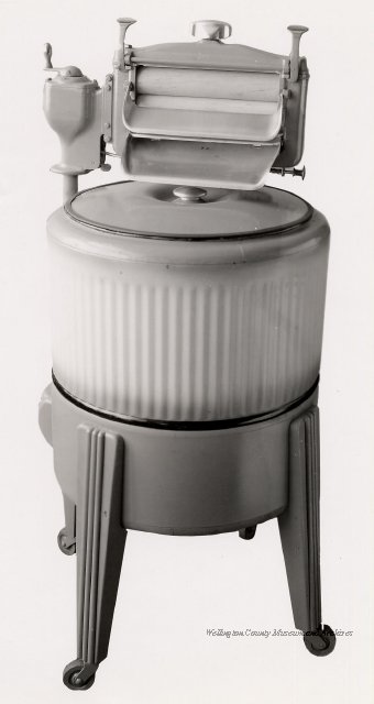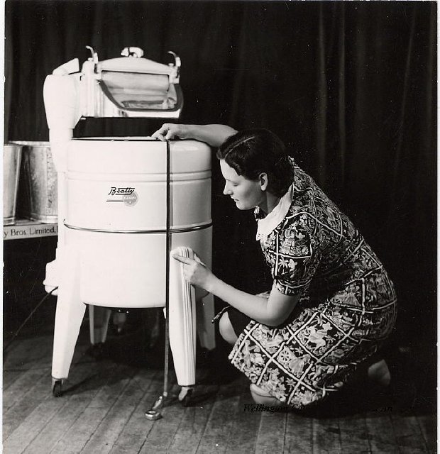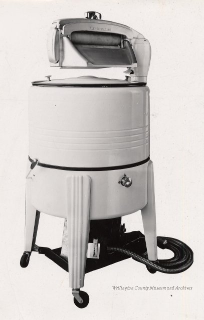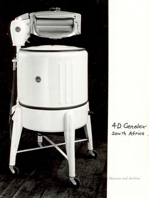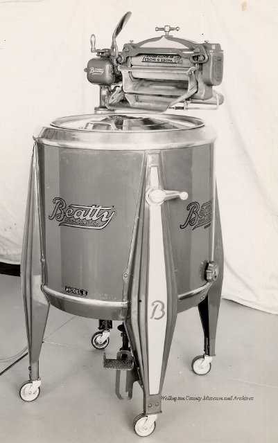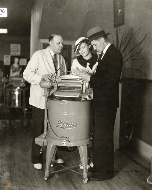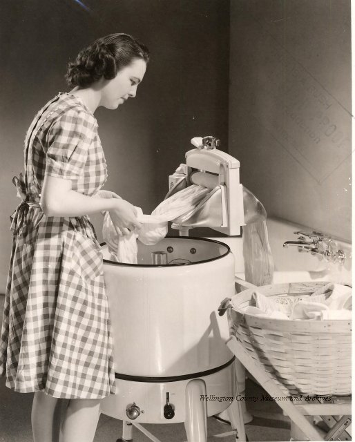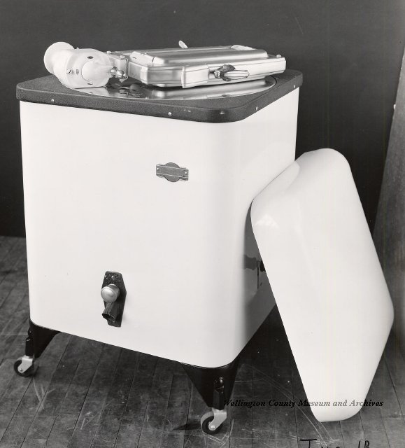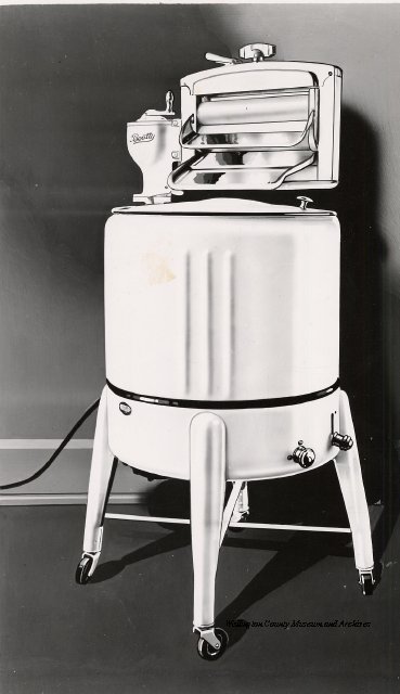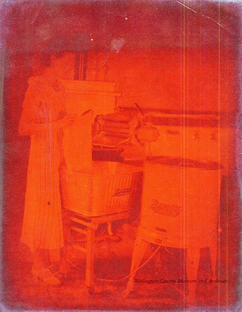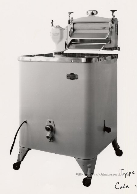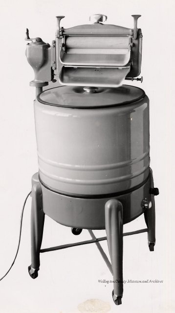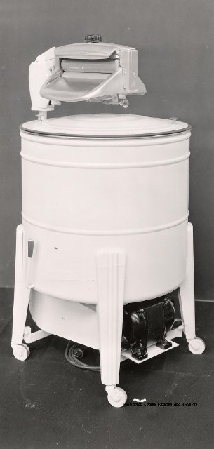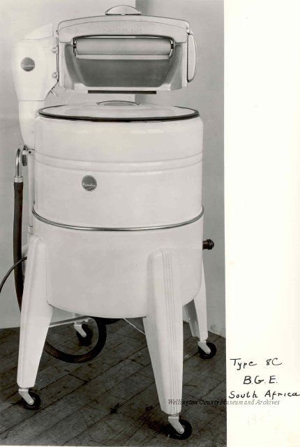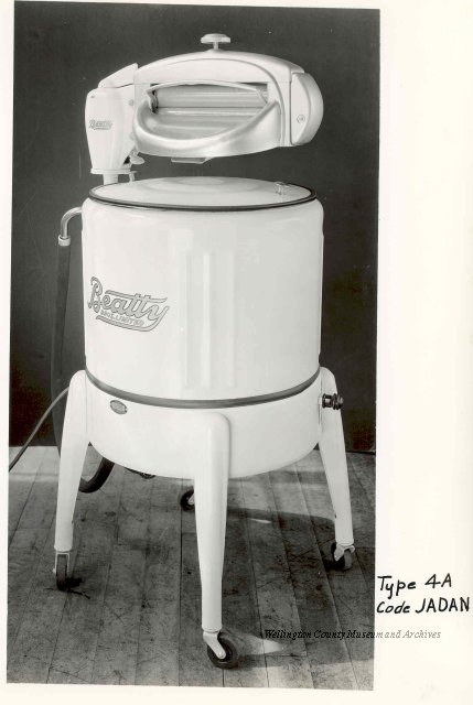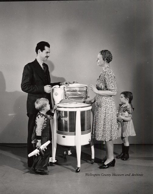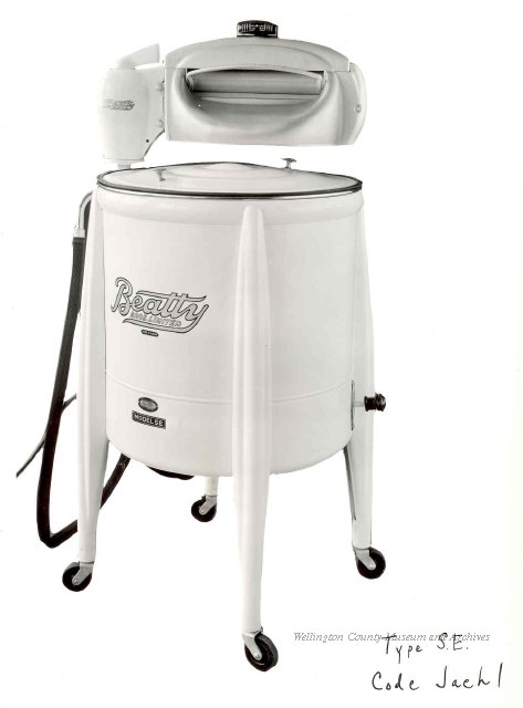 Beatty Bros., Fergus, Series 08, Photographs: Subseries 20, Washers, ph 26594 - ph 26705, 1939-ca.1950. Beatty Bros., Fergus, Series 08, Photographs: Subseries 20, Washers, ph 26594 - ph 26705, 1939-ca.1950. Mainly 8"x 10" b&w prints, removed from the photograph files indicated, numbered 5-90, and variously titled, and from file "Historical File No.979 - Beatty Washers / Photos". Photos are listed in the order of the files in which they were found. - ph 26594: Cutout, washer unidentified. Removed from file: "57. [Model] "2A" washer - photo file". - ph 26595: 2 images, Model "SE" [with different wringers]; one print with text on reverse: "Model 'SE' with pump for Spilhaus & Co., Capetown, S. Africa". Removed from file: "58. Export washers, photograph file". - ph 26596: [photo 10341 / neg.5949] Model " SE" washer (export) for S. Africa with Lovell wringer. Removed from file: "58. Export washers, photograph file". - ph 26597: Model "1A / Madeleine" for export. Removed from file: "58. Export washers, photograph file". - ph 26598: Model "SB" washer. Removed from file: "58. Export washers, photograph file". - ph 26599: 3 images, Model "Genalex" washer. Removed from file: "58. Export washers, photograph file". - ph 26600: Model "4A / Standard" washer. Removed from file: "58. Export washers, photograph file". - ph 26601: Model "ESB" engine drive washer. Removed from file: "58. Export washers, photograph file". - ph 26602: View into tub, Model "5A" washer. Removed from file: "58. Export washers, photograph file". - ph 26603: Dominion "Streamliner" washer. Removed from file: "58. Export washers, photograph file". - ph 26604: Portrait, 3/4 length, of King George and Queen Elizabeth, ca.1939. Removed from file: "58. Export washers, photograph file". - ph 26605: 5 images, man and woman with young boy and girl, and washer; in studio setting. Removed from file: "58. Export washers, photograph file". - ph 26606: 4-view sheet, hands with tools. Removed from file: "58. Export washers, photograph file". - ph 26607: Washer ["3A"?] with many vertical ribs on tub [unidentified]. Removed from file: "58. Export washers, photograph file". - ph 26608: 2 views, unidentified washer. Removed from file: "58. Export washers, photograph file". - ph 26609: 6 views, unidentified washers. Removed from file: "58. Export washers, photograph file". File: "60. Model "H" Hand washers, sample photo file" [EMPTY]. - ph 26610: Woman model / negative images]. Removed from file: "62. Washer Model "E". - ph 26611: 2 images, detail; men standing on washer drum/tub; [see also Model "M", file 65. Removed from file: "62. Washer Model "E". - ph 26612: Model "E". Removed from file: "62. Washer Model "E". - ph 26613: 2 men and woman with hat, with washer Model "E". Removed from file: "62. Washer Model "E". - ph 26614: Woman with Model "E" washer. Removed from file: "62. Washer Model "E". - ph 26615: Shaft and belt-driven laundry; Photo: Pringle & Booth, Toronto. Removed from file: "63. Old methods of washing". - ph 26616: Removed from file: "63. Old methods of washing". - ph 26617: 2 images within circle: woman with washtub and washboard, child. Removed from file: "63. Old methods of washing". - ph 26618: Model "R" washer. Removed from file: "64. Washer Model "R". - ph 26619: Closeup views, underneath of Model "M" [see also Model "E", file 62]. Removed from file: "65. Washer Model "M". - ph 26620: 2 views, Model "M" washer. Removed from file: "65. Washer Model "M". - ph 26621: Close-up, control handle. Removed from file: "65. Washer Model "M". - ph 26622: Woman model, with washer, laundry tubs, bench, basket. Removed from file: "65. Washer Model "M". - ph 26623: Washers lined up; overhead view into tub. Removed from file: "69. Washers - misc...". - ph 26624: Cutout, Model "Genalex" washer. Removed from file: "69. Washers - misc...". - ph 26625: 9 images, Beatty washer in institution with children; Eatonia wringer. Photos: Andre G. de Tonnancour, Montreal. - ph 26626: 2 images of washer, "not to be used for advertising or selling purposes / See Fred Armour, Engineering Dept. ... for E. Stevenson (W. Golightly), 4 July /39. Removed from file: "69. Washers - misc...". - ph 26627: Early washer; laundry tubs and washboards at right of image. Removed from file: "69. Washers - misc...". - ph 26628: "Graveyard at Toronto washer store". Removed from file: "69. Washers - misc...". - ph 26629: Woman model with washer, tubs, basket. Removed from file: "69. Washers - misc...". - ph 26630: Man in judge's robes[?]. Removed from file: "69. Washers - misc...". - ph 26631: Woman's hands and watch. Removed from file: "69. Washers - misc...". - ph 26632: Woman model with washer, young boy. Removed from file: "69. Washers - misc...". - ph 26633: Multi-views of women models. Removed from file: "69. Washers - misc...". - ph 26634: Line drawings, for washing machine advertisement[?]. Removed from file: "69. Washers - misc...". - ph 26635: Line drawings for washing machine advertisement[?]. Removed from file: "74. "Time Saver" & "White Cap". - ph 26636: Woman model holding curtains. Removed from: "75. Laundry illustrations ...". - ph 26637: Coloured illustration of King George and Queen Elizabeth with the Princesses Elizabeth and Margaret; see ph XXXXX. Removed from file: "76. Royal family washer illustrations". - ph 26637a: Sketch of King George and Queen Elizabeth with the Princesses Elizabeth and Margaret. - ph 26638: 2 images, woman with block-pattern dress, with Model "8A" and "8B" washers. Removed from file: "79. Model "8A" electric and engine drive washer, photograph file". - ph 26639: 3 images, man with electric motor and gasoline engine; close-up of bottom plate. Removed from file: "79. Model "8A" electric and engine drive washer, photograph file". - ph 26640: "Standard" / Model "8A"[?] washer. Removed from file: "79. Model "8A" electric and engine drive washer, photograph file". - ph 26641: Hand on control, vertical-ribbed tub; text on reverse: "Change d