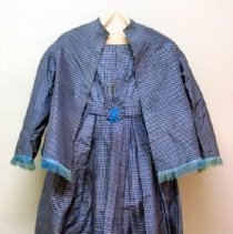 A child's silk taffeta dress (.01), jacket (.02), and cummerbund (.03), circa 1868. The dress (.01) is of blue and white checked silk taffeta and is lined with stiff muslin cotton. It has a rounded neckline with no collar. It has a small yoke which comes to a point at the bottom centre, front and back. There are vertical pleats on the bodice. There is a very small inserted waistband. Around the waist is a small cummerbund (.03) of the same materi...