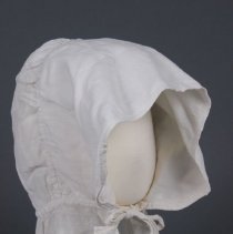 A white linen sunbonnet with tabby weave with three pieces: brim, crown and curtain. It has two ties