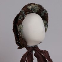 A brown bonnet with a silk ribbon fastener dated before 1900. The bonnet has embroidered flowers in rayon floss outlined with glass beads.