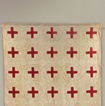 A red and white machine sewn signature quilt made by "The Girls of Riverside Women's Institute" in 1918 (embroidered inscription on reverse of quilt). The quilt has six rows with five blocks across and a red cross appliqued in the centre of each square. Four rows of names are embroidered diagonally across each corner in red thread. It is quilted around the border of squares and on the edge of the cross.