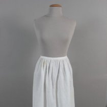 Woman's full-length, white cotton half apron with plain sewing, gathers and tucks .